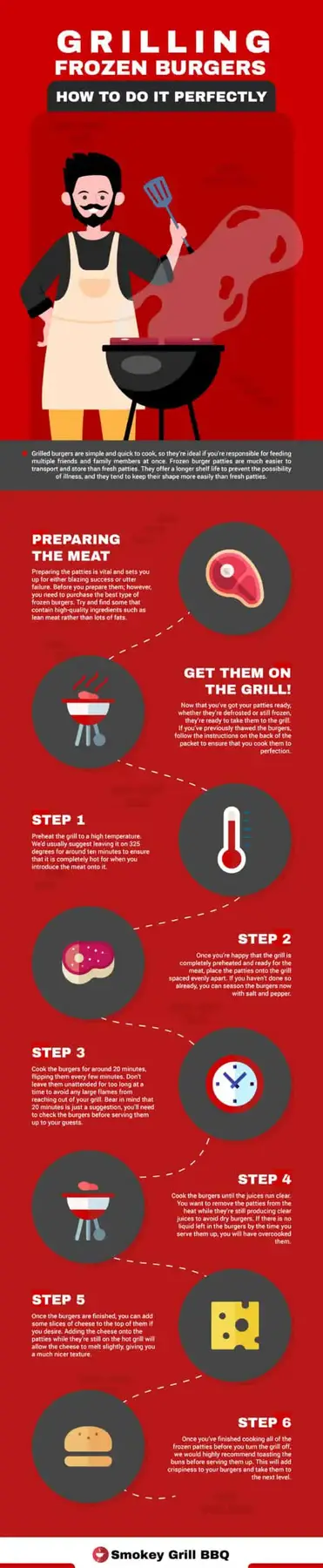 After 5 minutes the patties should be soft and pliable. How do you cook a hamburger on a grill? First things first, separate the patties from one another using a butter knife or spatula. Even after handling raw beef patties, make sure to wash your hands thoroughly before you start cooking. Just place the frozen burger on the hot grill and leave it for about two minutes on one side and then do the same for the other.